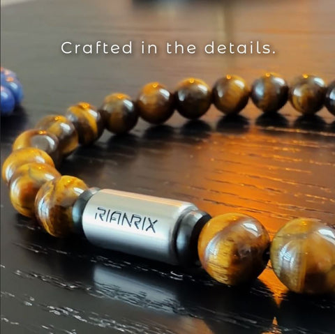 Each stone is carefully selected for its warm golden tones and natural variation, giving every bracelet a unique depth and presence. A matte black stainless steel spacer and round Rianrix-branded charm add contrast and structure without overpowering the stone.